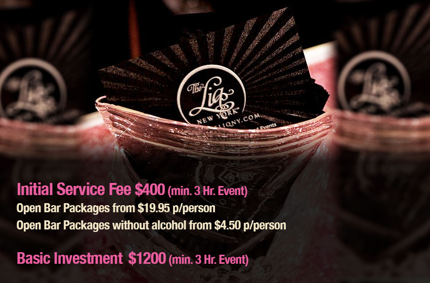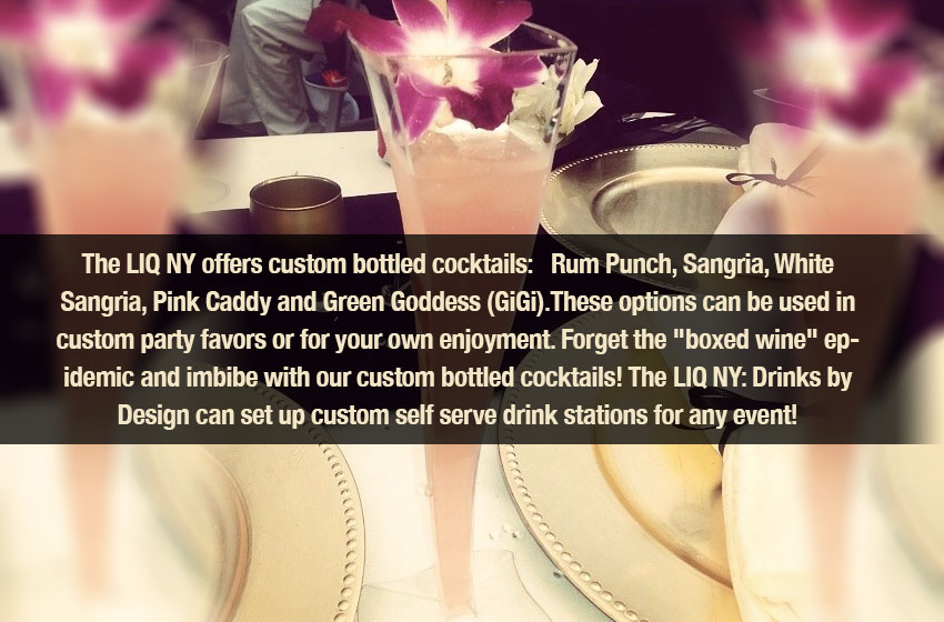 The LIQ New York is an event lifestyle brand that creates custom themed cocktails using top-shelf beverages, premium ingredients and offers an equally exceptional atmosphere in which you and your guests are to be served. Noted for our visual presentation, we've provided spirits, savoir-faire and white-glove delivery for all event types and sizes from weddings, exclusive corporate events to uber-luxurious private affairs.